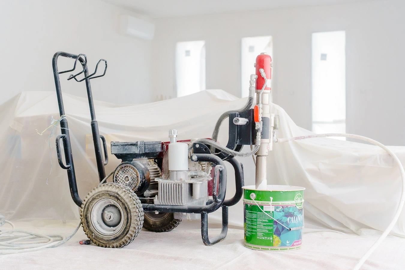 Après avoir soigneusement protégé toutes les surfaces non concernées, nous réalisons un enduisage complet au pistolet sur les plafonds et les murs.